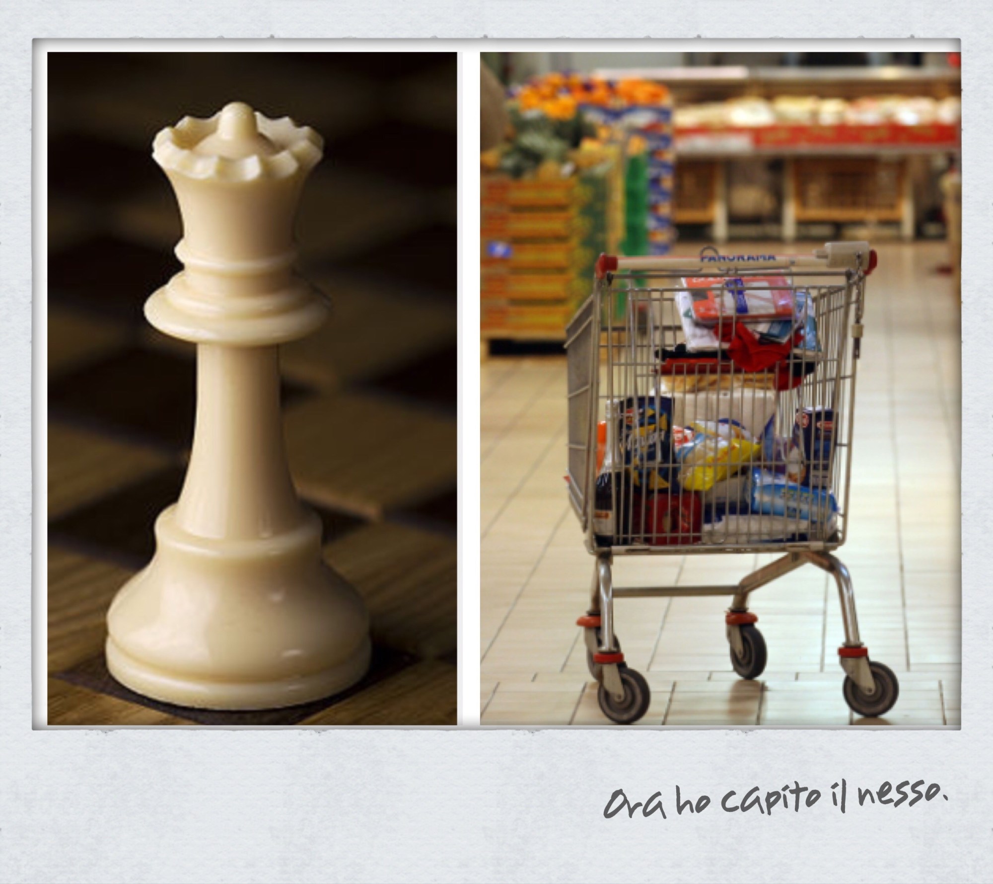 [oggi ho imparato che]Un giorno ti svegli e mentre sei nei corridoi del supermercato a cercare quattro cose per il pranzo e un paio di calze velate di fortuna che le tue si sono rotte e non puoi andare in ufficio così, realizzi che la pedina degli scacchi che si muove solo in diagonale l’hanno chiamata”Alfiere” perché “İl carrello vecchio del supermercato H24” era troppo lungo.