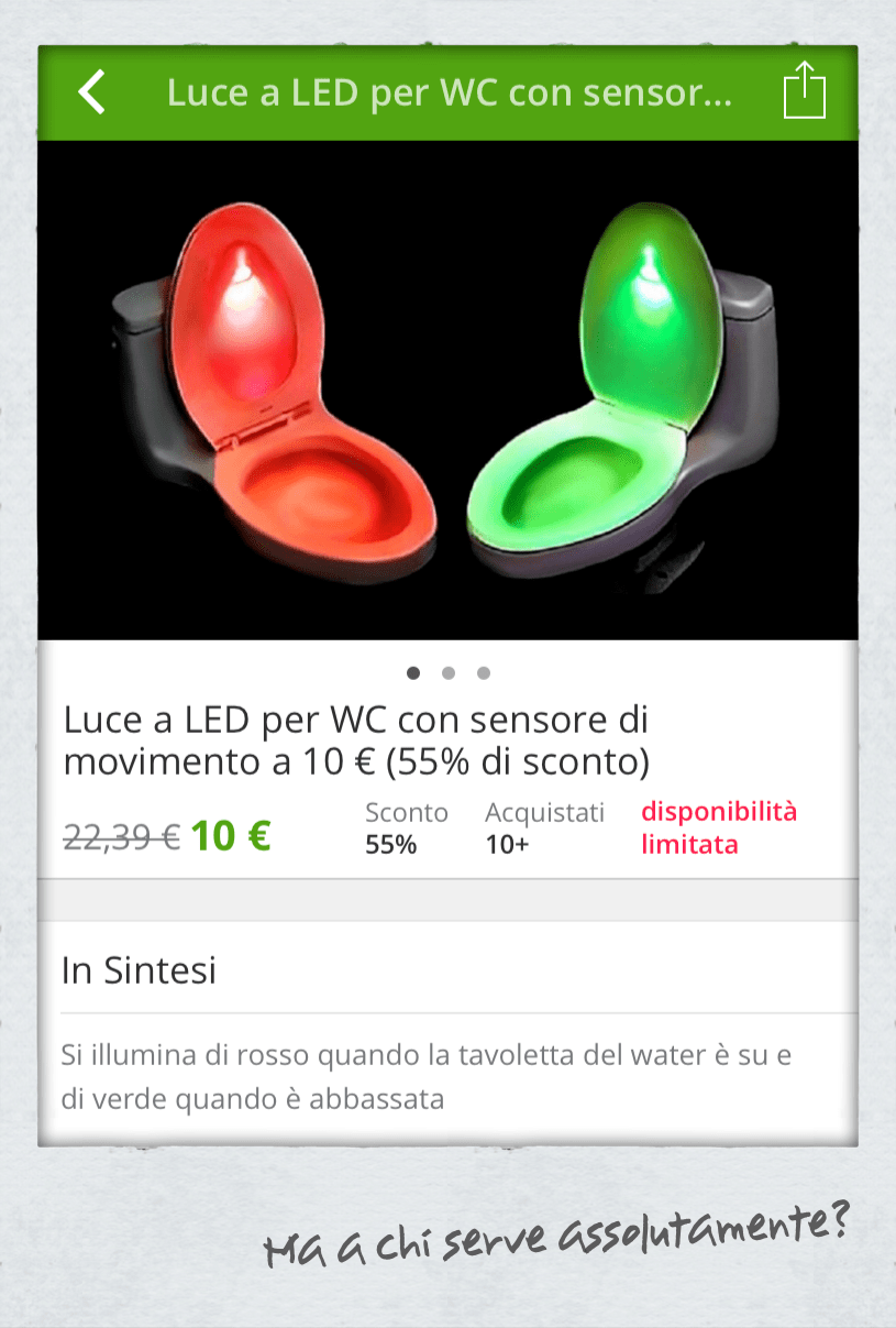 Un giorno per caso ti svegli e mentre stai facendo colazione spipolando sulle varie App ti imbatti in un nuovo nuovissimo prodotto venduto da Groupon: la luce a led per illuminare il WC con sensori.
