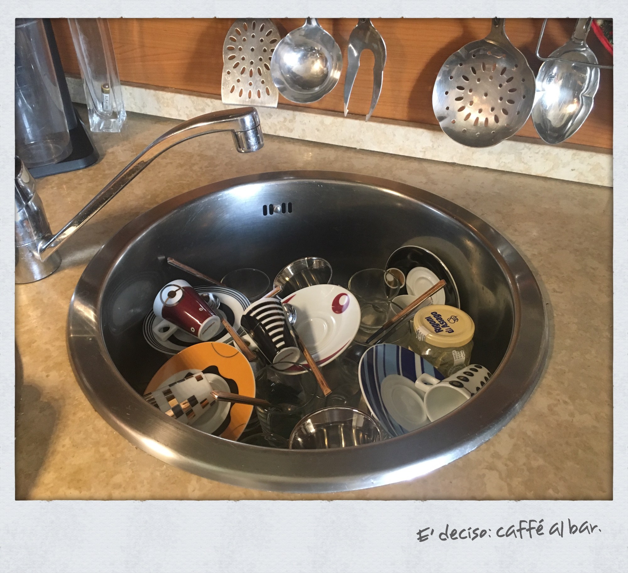 Oggi ho imparato che…Una mattina per caso ti svegli vai in cucina e, guardando la Nespresso e il lavandino, realizzerai che potrai anche avere un milione di cialde di caffè nella dispensa, ma in nessuna casa al mondo il numero di tazzine da caffè sarà mai, davvero mai, abbastanza. Prima o poi arriverà quella tragica mattina in cui una donna si sveglierà, scoprirà che sono tutte da lavare e sarà costretta a uscire per andarsi a prendere il caffè al bar!