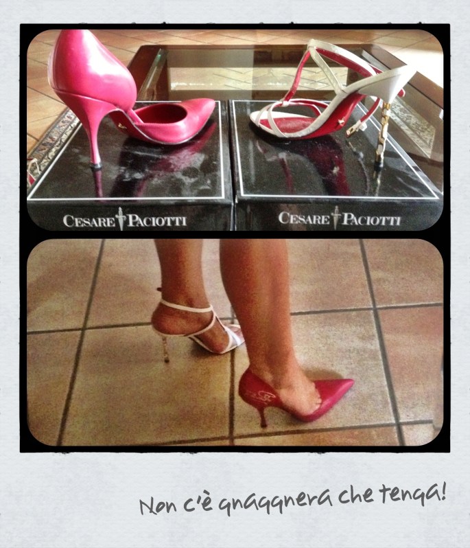Entrerai nel tuo ‘ripostiglio magico’ e tirerai fuori due scatole a caso: dovrai decidere di affidare le sorti della tua serata a un paio di decolletes fucsia o a un paio di sandali bianchi con tacco gioiello entrambi di Cesare Paciotti… E ti tornerà il sorriso. Contro un paio di scarpe non c’è gnaggnera che tenga!