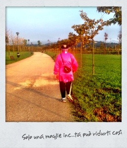 Se una mattina per caso mentre sei alla Trucca a correre con la tua compagna, incrociate un tizio che cammina indossando tuta nera, scarpe da corsa e un impermeabilino fucsia fosforescente non potrete fare a meno di commentare che ‘solo una moglie molto molto incazzata può comprargli quell’orrore e permettergli di andare a camminare alla Trucca conciato così.’