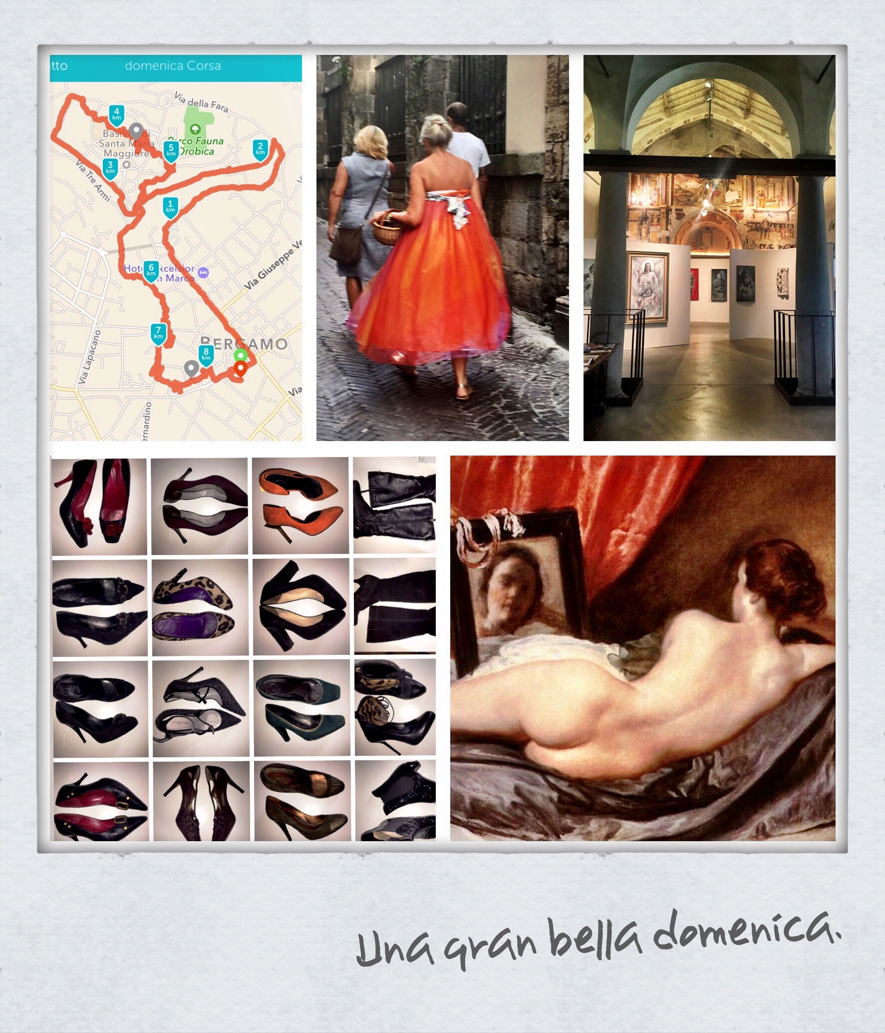 – Incrociato la migliore installazione vivente di Città Alta, una gallerista d’arte che ogni settimana indossa degli abiti che sono una poesia o una fiaba, e fotografarla.