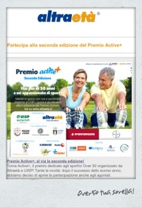Un giorno per caso ti svegli, ti lavi, ti vesti ed esci di casa di corsa per non vuoi arrivare tardi e, mentre sei sulla pensilina della metropolitana che da Gessate ti porta in centro, leggi le tue email e la tua attenzione viene catturata da una delle ultime newsletter arrivate. E in pochissimi istanti scoprirai come sia facile lanciare nell’etere un ‘vaffa con sentimento’ se scopri di essere finita in una mailing list di sportivi ultracinquantenni. E in altrettanti pochissimi istanti deciderai che no, NON HAI NESSUNA INTENZIONE di partecipare ad Active+, il premio dedicato agli sportivi ultracinquantenni. Non subito, almeno. Non prima di aver compiuto 50 anni. Quindi tra più o meno xyz anni. Ecco.