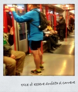 Se poi prosegui e cambi linea e ti ritrovi vicino ad un tizio ‘tortellino’ in tenuta da running davanti alle porte in attesa di scendere alla fermata giusta, non potrai fare a meno di immaginartelo mentre dice ai suoi amici in Corso Buenos Aires ‘vado a farmi una sgambata, ci vediamo in Duomo tra mezz’ora’; poi prende la metro, scende a Duomo e si fionda da Luini per un panzerotto e alla fine si presenta all’appuntamento con 7 minuti di ritardo (la coda da Luini è una certezza) dicendo di aver fatto ‘il giro largo che con questa giornata la voglia di correre aumenta’. E la prima cosa che penserai sarà ‘Runner ciccio #haivintotutto